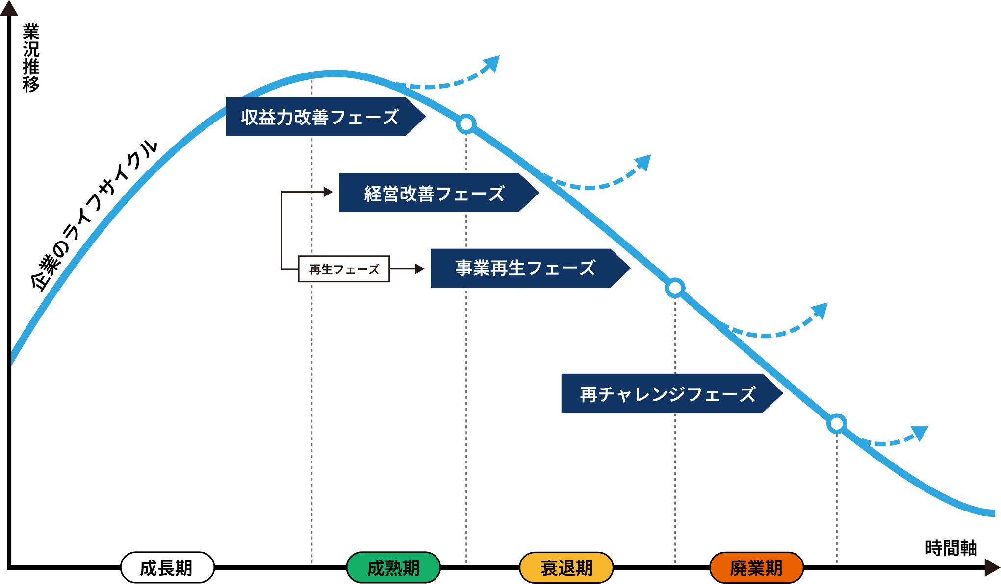 売上・利益は安定し基盤が確立する時期。成長鈍化により新規投資や資金繰り改善が求められる。衰退期